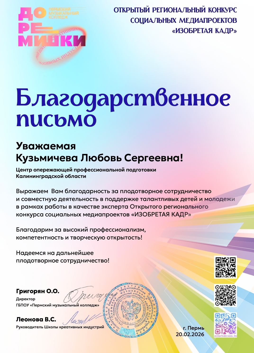 переданных мною лично Оператору, а также полученных Оператором с моего письменного согласия от третьей стороны в частности, следующих моих персональных данных: фамилия, имя, отчество; дата рождения; образование (наименование учебного заведения, год окончания, документ об образовании, квалификация специальность); должность и место работы; паспорт (номер, дата выдачи, кем выдан) или иной документ, удостоверяющий личность; адрес места жительства (по паспорту или фактический); номер телефона; дополнительные сведения, представленные мною по собственному желанию.