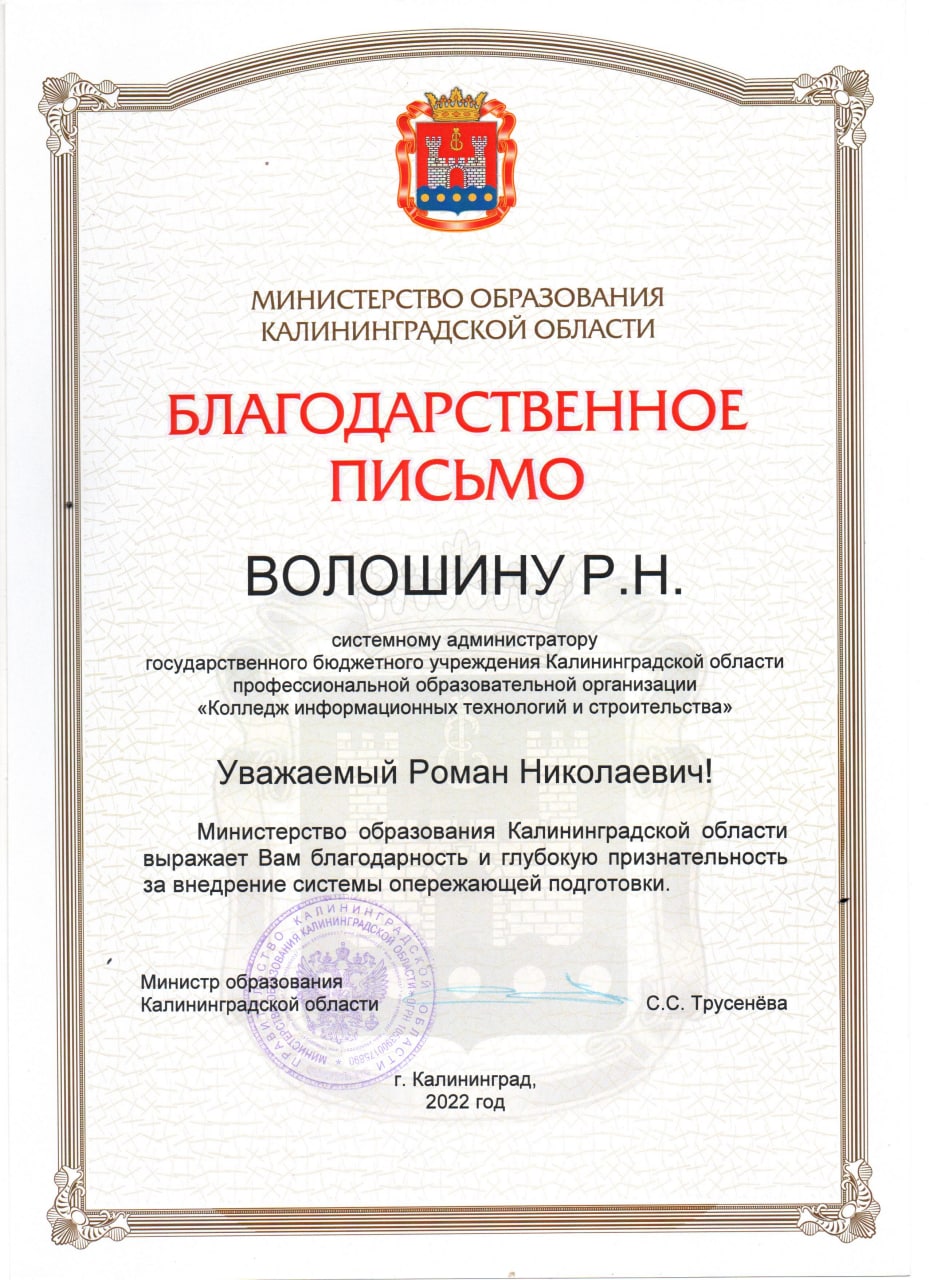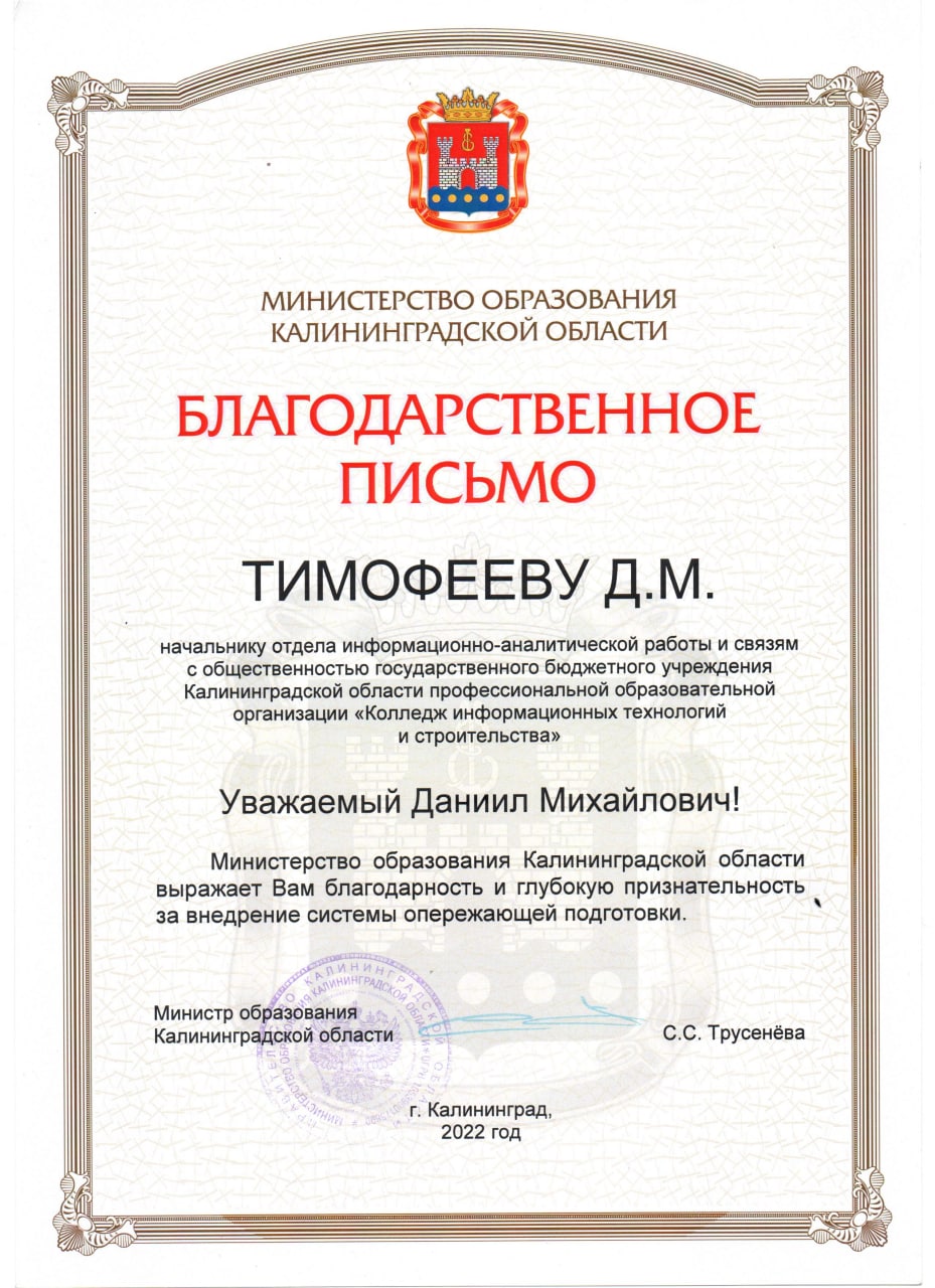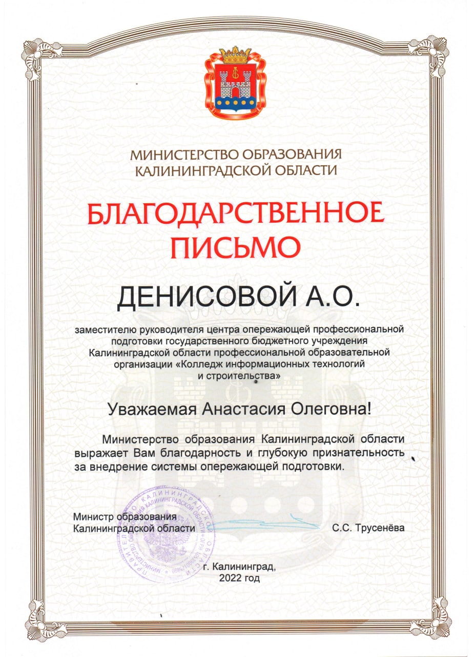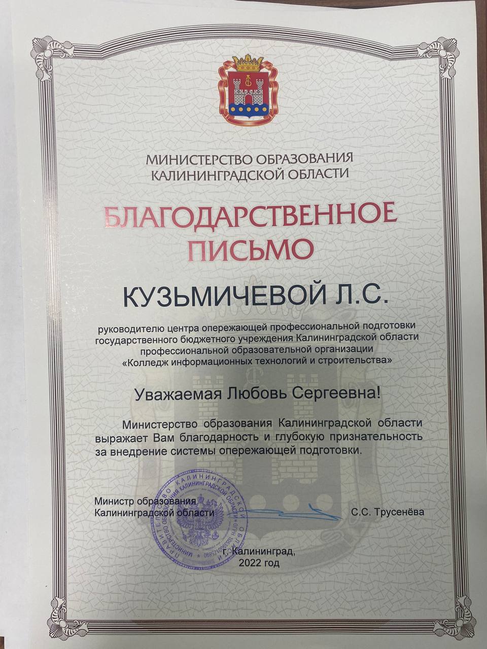 Впредверие дня учителя коллектив ЦОПП был награжден Благодарственными письма Министра образования Калининградской области Трусеневой Светланы Сергеевны за внедрение системы опережающей подготовки.